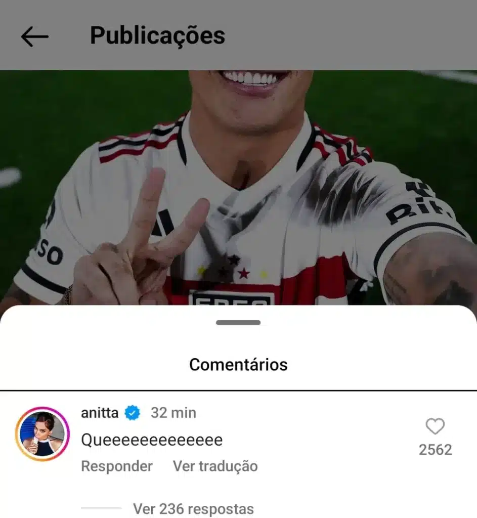 “Queeeeeee”, comentou a cantora em tom de surpresa. Claro que a torcida são-paulina se divertiu e passou a enviar diversas mensagens para a estrela brasileira.