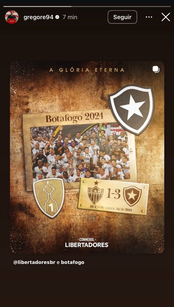 “Era um dia 30 como esse. Aquela tarde em Buenos Aires foi inesquecível. Alcançar a Glória Eterna com o Glorioso parecia coisa de destino mesmo. Tinha que acontecer. E aconteceu. Conseguimos fazer a Estrela Solitária brilhar no ponto mais alto da América, momento incrível e que pra sempre vou recordar. Há 1 ano, a história foi feita”, publicou Luiz Henrique, Rei da América de 2024.