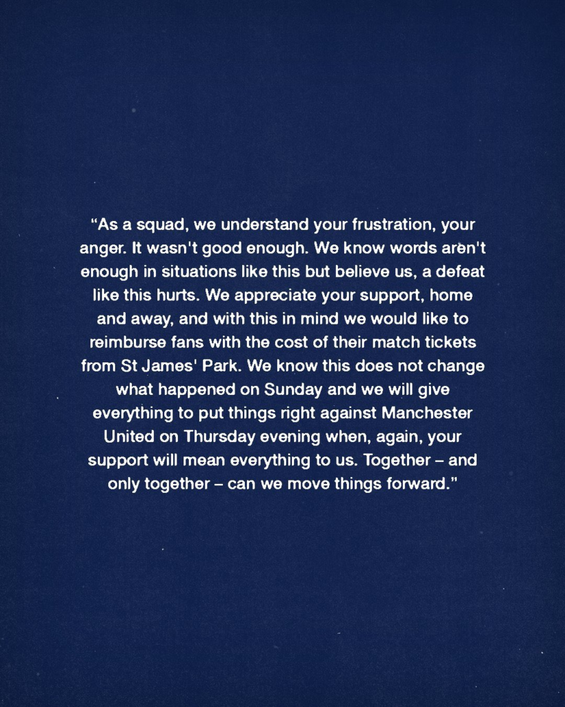 Em nota, o elenco pediu desculpa à torcida que se deslocou até o estádio St. James’ Park, em Newcastle, para torcer e apoiar o time, afirmou que irá reembolsar os ingressos, porém entende que nada muda a situação do último domingo.