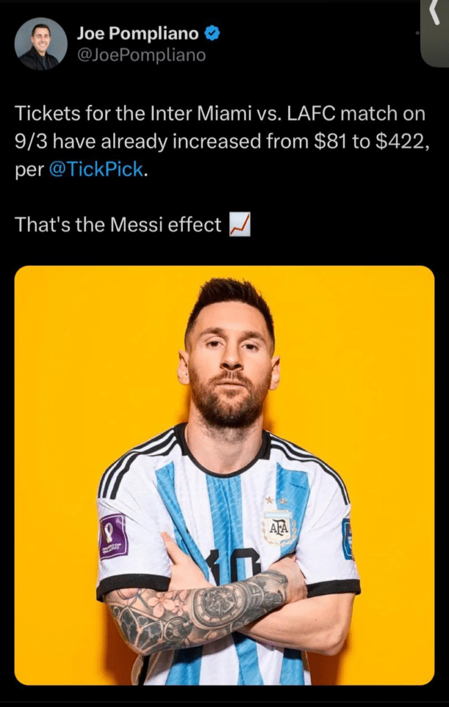 Antes da coletiva de Messi, o preço mais baixo de um ingresso para o jogo de sua possível estreia estava custando 29 dólares na terça-feira (06). No entanto, na quarta-feira (07), o preço disparou para 329 dólares, ou seja, um salto de 1.034% de acordo com o TickPick.