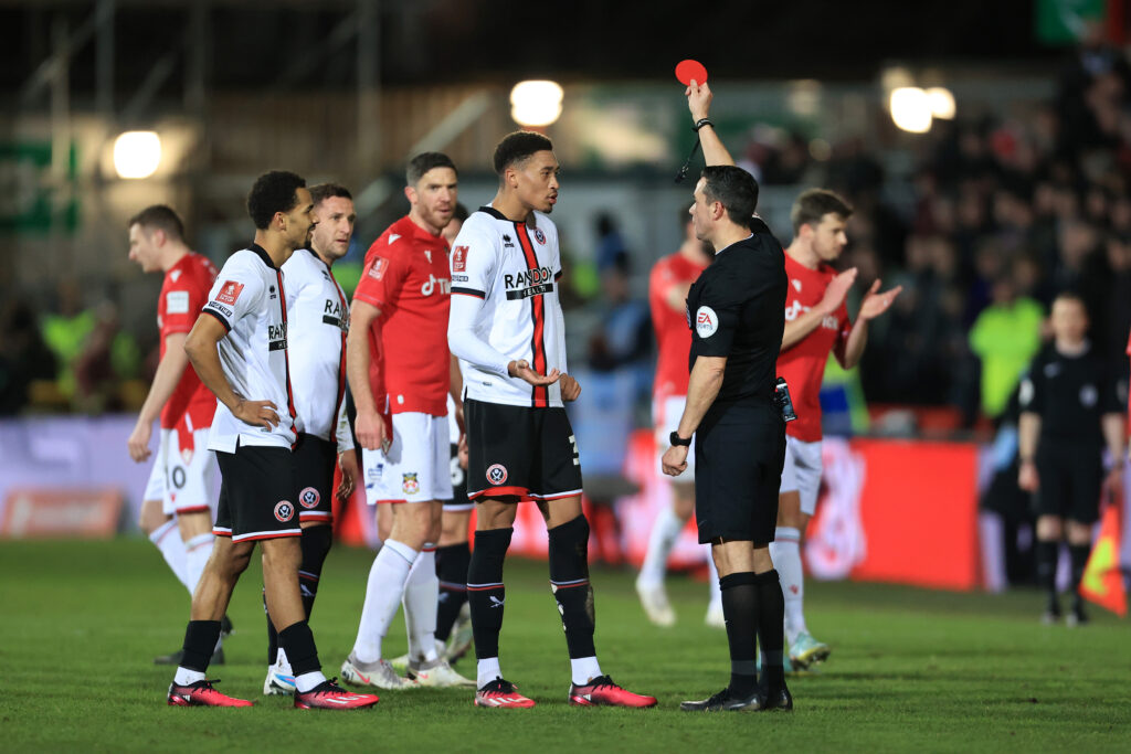 Uma cena inusitada chamou a atenção na partida entre Wrexham e Sheffield United, válida pela quarta rodada da Copa da Inglaterra. Aos 25 minutos do segundo tempo, ele apresentou um cartão vermelho para Daniel Jebbison. Até aí, tudo normal, porém, o objeto tinha um formato diferente do usual.