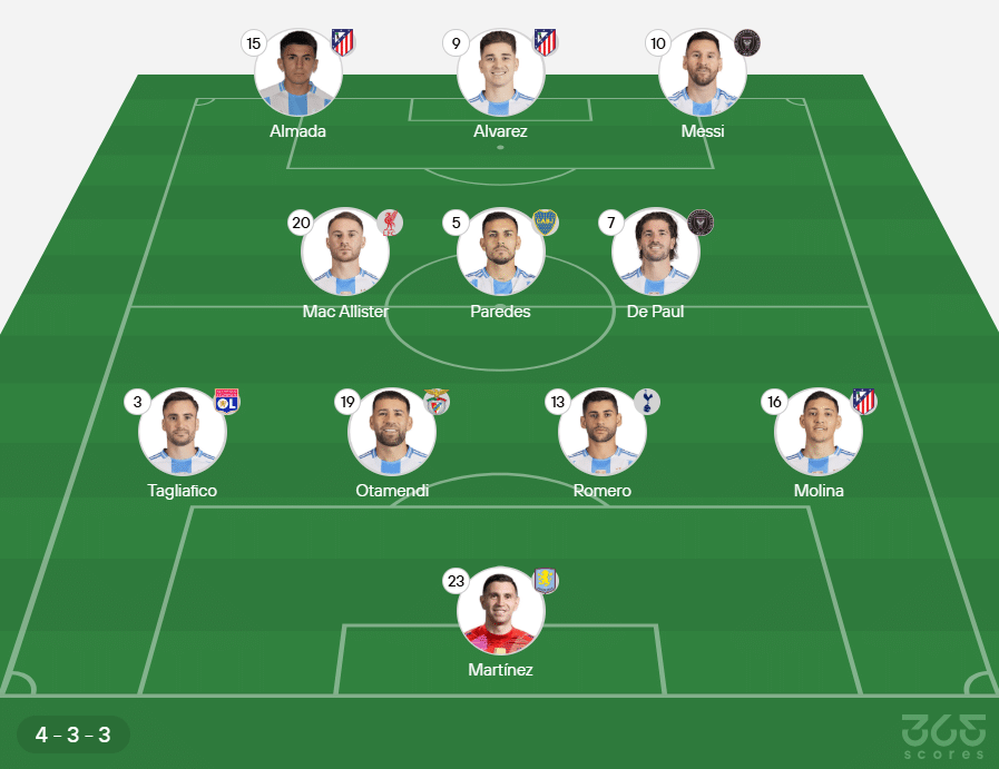 Para o confronto, o técnico Lionel Scaloni deve manter a base do time que vem tendo bons resultados no torneio. Lionel Messi deve estar entre os titulares, assim como Almada, ex-Botafogo e atualmente no Atlético de Madrid e Julian Alvares, também do clube espanhol.