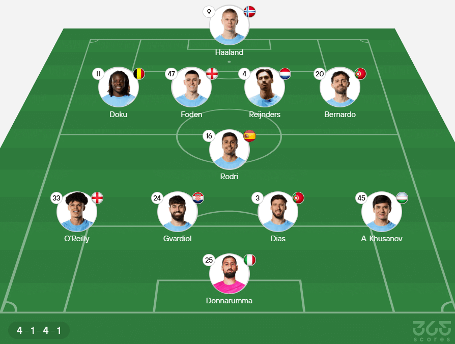 Provável escalação do Manchester City: Donnarumma; Khusanov, Rúben Dias, Gvardiol e O’Reilly; Rodri; Reijnders, Bernardo Silva, Doku e Phil Foden; Haaland.