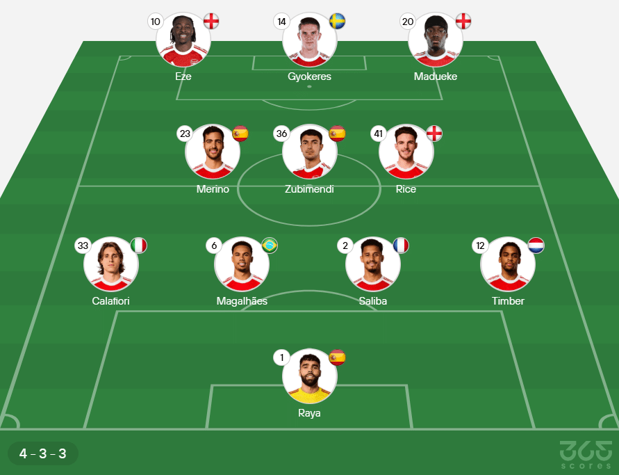 - Provável escalação do Arsenal: Raya; Timber, Saliba, Gabriel Magalhães e Calafiori; Zubimendi, Merino e Declan Rice; Eze, Madueke e Gyokeres.