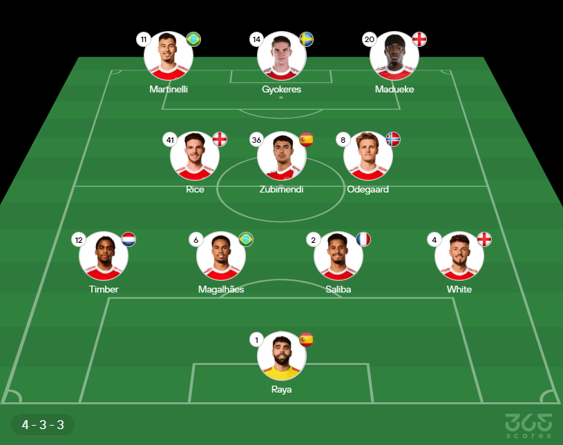 - Escalação do Arsenal: Raya, Ben White, Saliba, Gabriel Magalhães e Timber; Odegaard, Zubimendi e Declan Rice; Madueke, Gabriel Martinelli e Viktor Gyökeres (Gabriel Jesus)