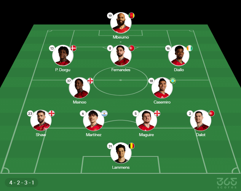 Escalação do Manchester United: Lammens, Diogo Dalot, Harry Maguire, Lisandro Martínez e Luke Shaw; Casemiro, Kobbie Mainoo, Amad Diallo, Bruno Fernandes e Patrick Dorgu; Bryan Mbeumo. Técnico: Michael Carrick.