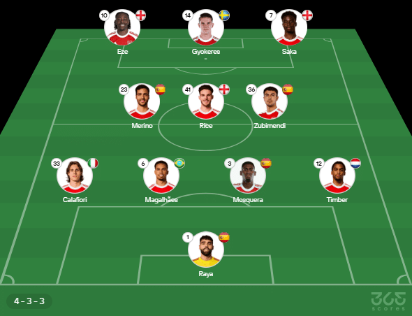 - Provável escalação do Arsenal: Raya; Calafiori, Gabriel Magalhães, Mosquera e Timber; Merino, Rice e Zubimendi; Eze, Gyokeres e Saka