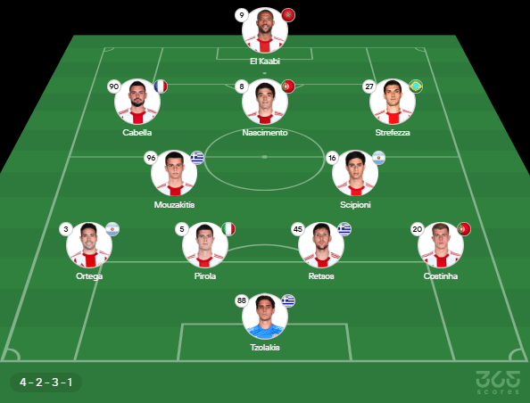 Provável escalação do Olympiacos: Tzolakia; Ortega, Pirola, Retaos e Costinha; Mouzakitis e Scipioni; Cabella, Nascimento e Strefezza; El Kaabi. Técnico: José Luis Mendilibar.