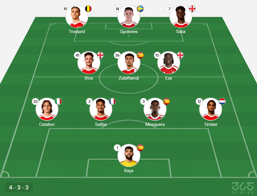 - Provável escalação do Arsenal: Raya; Timber, Mosquera, Saliba e Calafiori; Zubimendi, Declan Rice e Eze; Trossard, Bukayo Saka e Gyokeres.