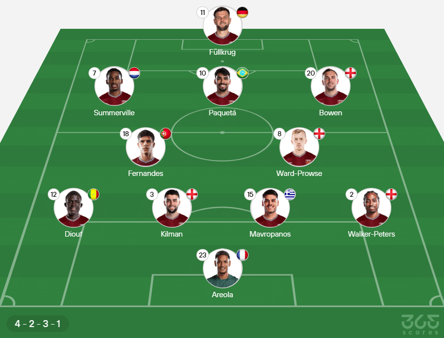 Provável escalação do West Ham: Areola; Walker-Peters, Mavropanos, Kilman e Diouf; Ward-Prouse e Mateus Fernandes; Lucas Paquetá, Summerville e Bowen; Füllkrug.