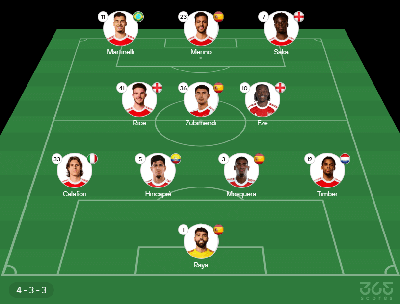 - Provável escalação do Arsenal: Raya; Timber, Mosquera, Hincapié e Calafiori; Eze, Zubimendi e Rice; Saka, Merino e Martinelli