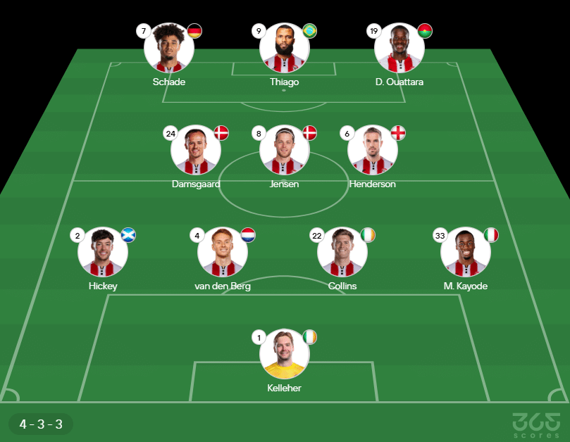 Provável escalação do Brentford: Kelleher; Kayode, Collins, van den Berg e Hickey; Henderson, Jensen e Damsgaard; Ouattara, Igor Thiago e Schade. Técnico: Keith Andrews.