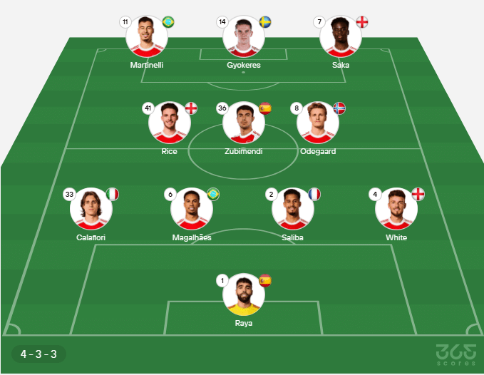 - Provável escalação do Arsenal: Raya, White, Saliba, Gabriel Magalhães, Calafiori; Zubimendi, Rice, Odegaard; Saka, Martinelli, Gyökeres