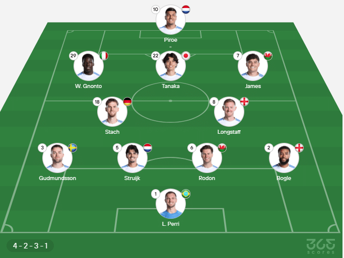 - Provável escalação do Leeds United: Lucas Perri, Bogle, Rodon, Struijk, Gudmundsson; Longstaff, Stach, James, Gnonto, Tanaka; Piroe