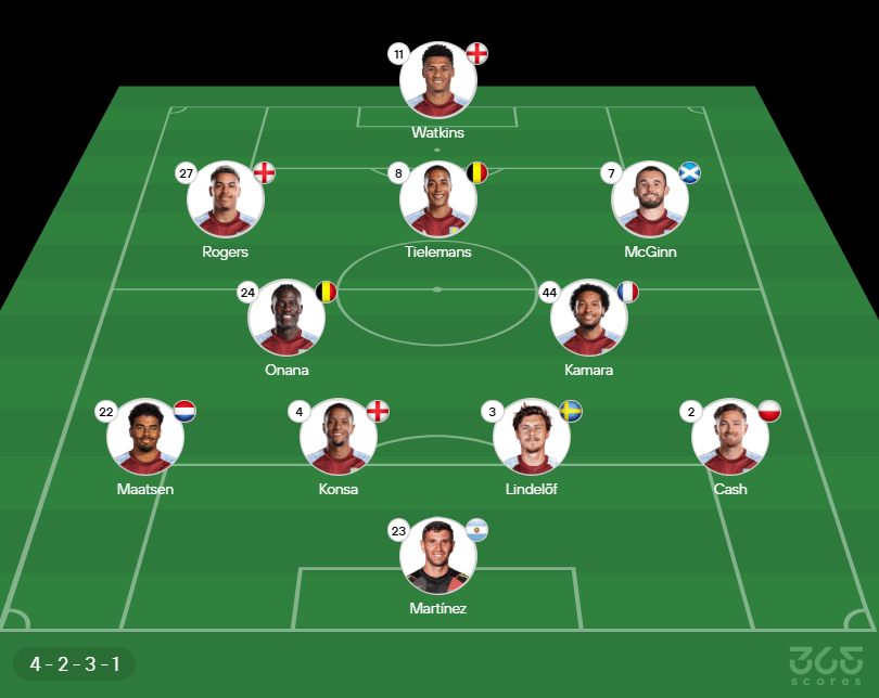 Escalação do Aston Villa: Emiliano Martínez, Cash, Lindelof, Konsa e Maatsen; Kamara, Onana, McGinn, Tielemans e Morgan Rogers; Ollie Watkins. Técnico: Unai Emery.