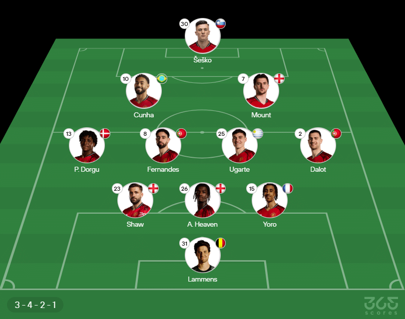 Escalação do Manchester United: Lammens, Leny Yoro, Heaven e Luke Shaw; Diogo Dalot, Ugarte, Bruno Fernandes e Patrick Dorgu; Mason Mount, Matheus Cunha e Benjamin Sesko. Técnico: Rúben Amorim.