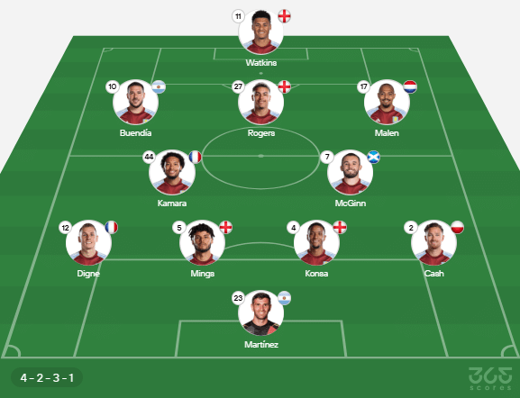 - Provável escalação do Aston Villa: Martínez, Cash, Konza, Mings, Digne; McGinn, Kamara, Malen, Buendía, Rogers; Watkins