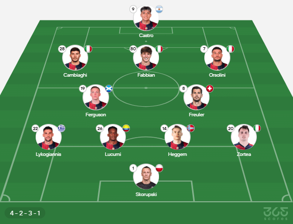 - Provável escalação do Bologna: Skorupski, Zortea, Heggem, Lucumi, Lykogiannis; Freuler, Ferguson, Orsolini, Cambiaghi, Fabbian; Castro