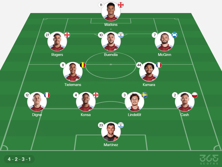 Escalação do Aston Villa: Dibu Martínez; Cash, Lindelöf, Konsa e Digne; Kamara e Tieleman; Buendía, Rogers e McGinn; Watkins.