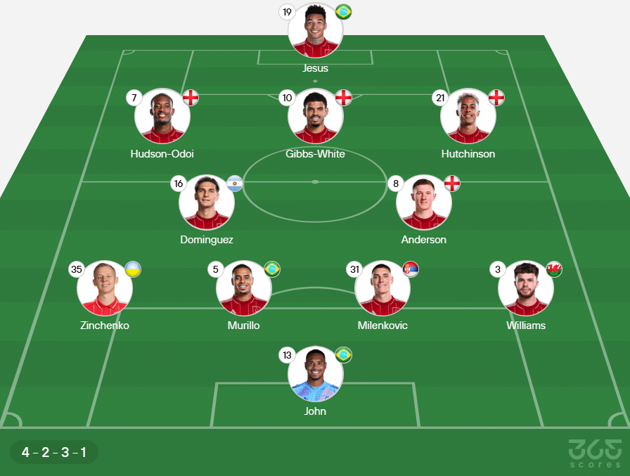 Escalação do Nottingham Forest: John; Williams, Milenkovic, Murillo e Zinchenko; Anderson e Domínguez; Morgan Gibbs-White, Hutchinson e Hudson-Odoi; Igor Jesus.