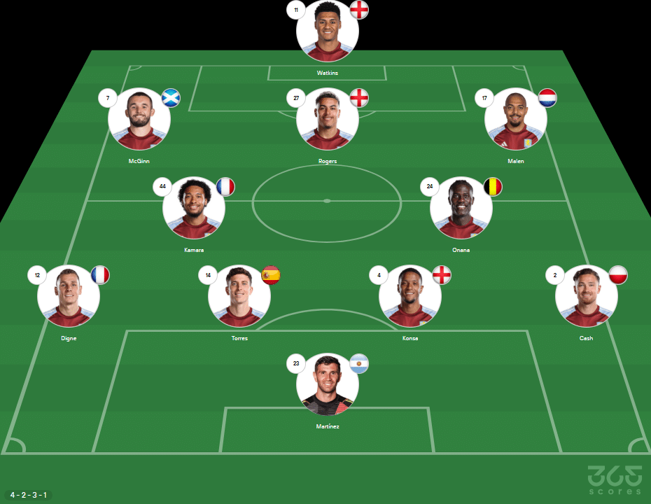 - Provável escalação do Aston Villa: Dibu Martínez; Lucas Digne, Pau Torres, Konsa e Matty Cash; Kamara e Onana; McGinn, Rogers e Malen; Watkins