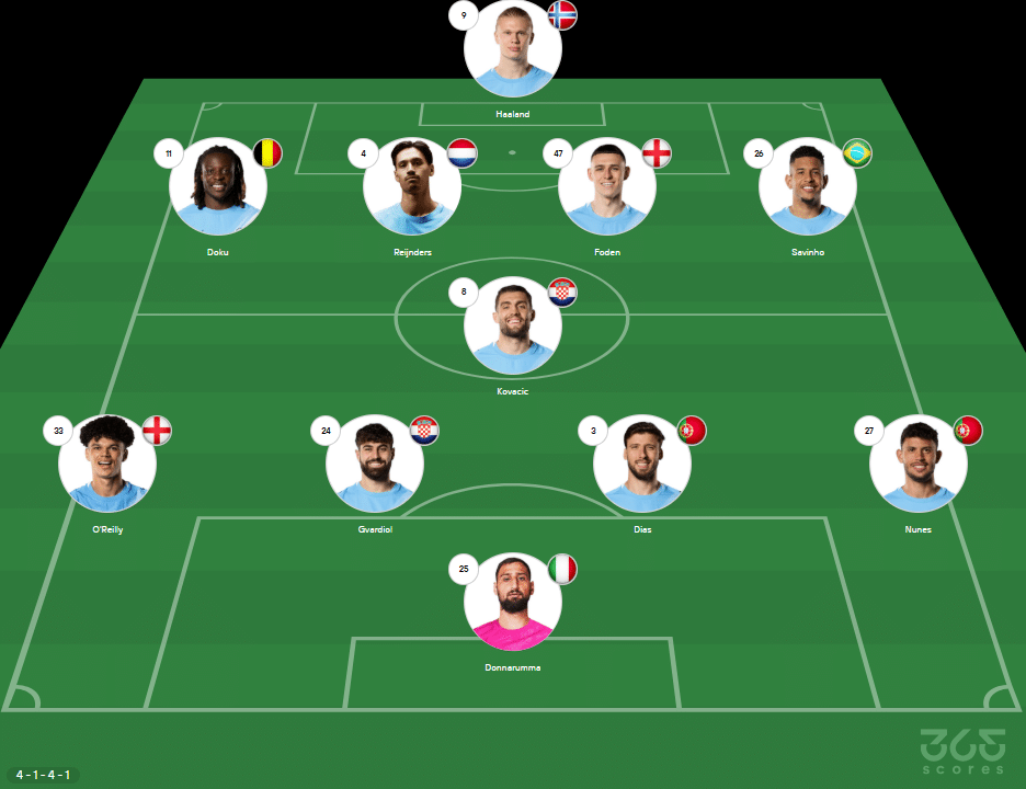 - Provável escalação do Manchester City: Donnarumma; O’Reilly, Gvardiol, Ruben Dias e Matheus Nunes; Kovacic, Doku, Reijnders, Foden e Savinho; Haaland
