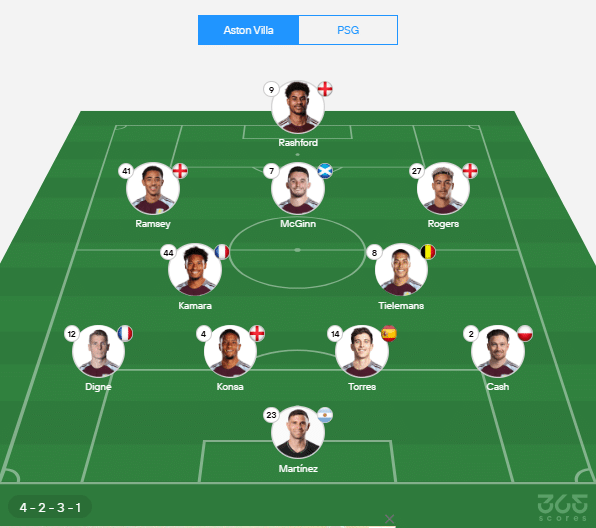 - Provável escalação do Aston Villa: Martínez; Cash, Torre, Konsa, Signe; Tielemans, Kamara, McGinn; Rogers, Ramsey, Rashford