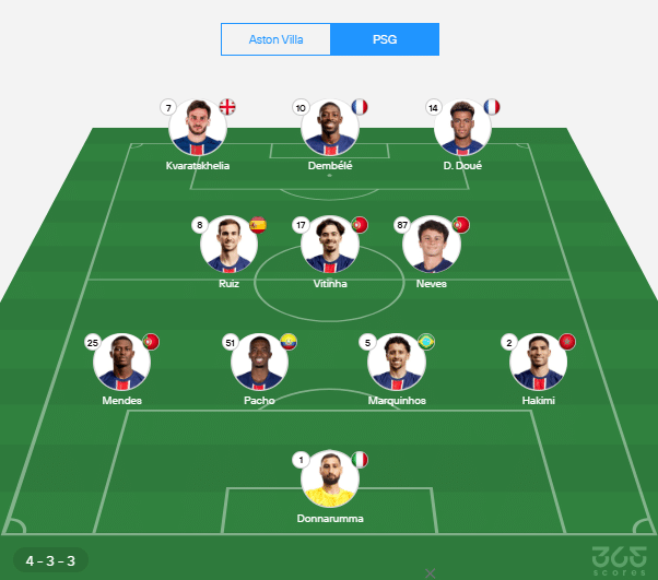 - Provável escalação do PSG: Donnarumma; Hakimi, Marquinhos, Pacho, Mendes; Neves, Vitinha, Ruiz; Doué, Kvaratskhelia e Dembelé