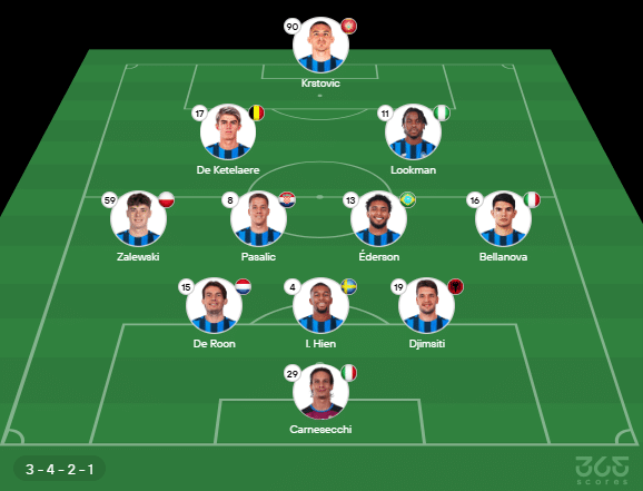 Provável escalação da Atalanta: Carnesecchi; De Roon, Hien e Djimsiti; Zalewski, Pasalic, Éderson e Bellanova; De Ketelaere e Lookman; Krstovic. Técnico: Ivan Jurić.