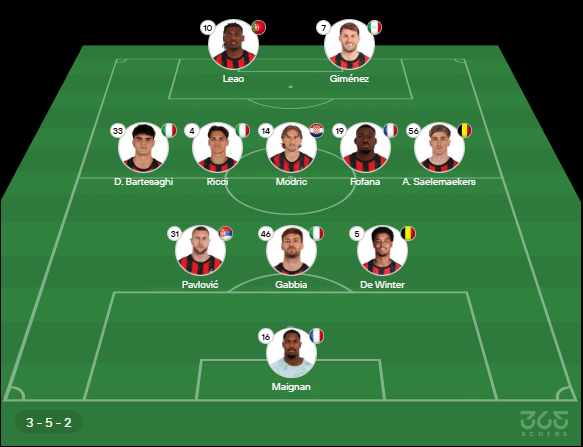 Provável escalação do Milan: Maignan; Pavlovic, Gabbia e De Winter; Bartesaghi, Ricci, Modric, Fofana e Saelemaekers; Rafael Leão e Giménez. Técnico: Massimiliano Allegri.