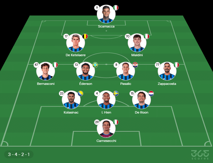 - Escalação da Atalanta: Carnesecchi; De Roon, Hien, Kolasinac; Zappacosta, Pasalic, Éderson, Bernasconi, Maldini, De Ketelaere; Scamacca