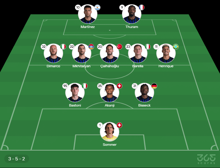 - Escalação da Inter de Milão: Sommer; Bisseck, Akanji, Bastoni; Luis Henrique, Barella, Çalhanoglu, Mkhitaryan, Dimarco; Thuram, Martínez
