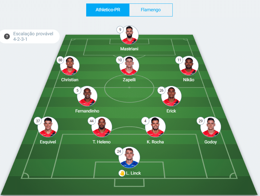 Provável escalação do Athletico-PR: Linck; Godoy, K. Rocha, Thiago Heleno, Esquivel; Erick, Fernandinho, Zapelli; Nikão, Christian e Mastriani.