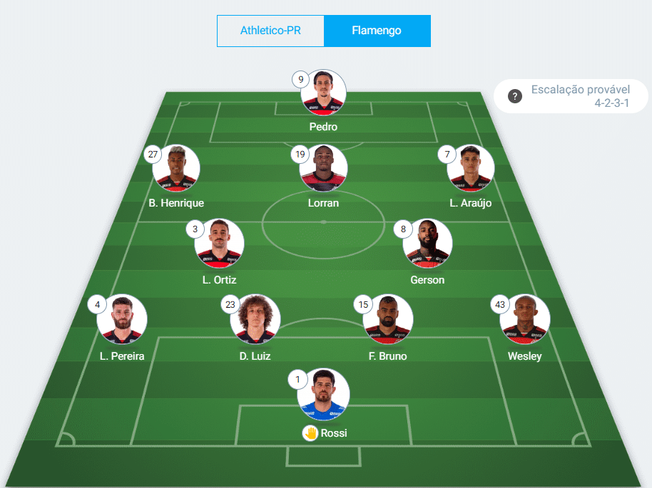 Provável escalação do Flamengo: Rossi; Wesley, Fabrício Bruno, David Luiz, Léo Pereira; Gerson, Léo Ortiz, Lorran; L. Araújo, Bruno Henrique e Pedro.