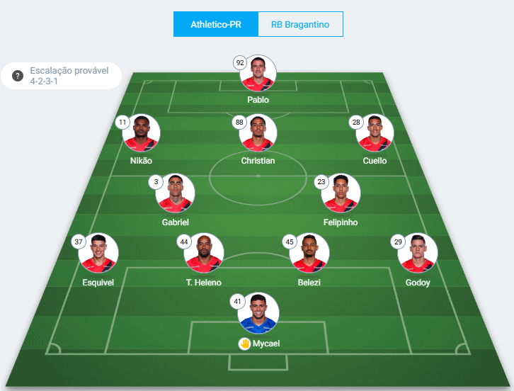 - Provável escalação do Athletico-PR: Mycael; Godoy, Belezi, T. Heleno, Esquível; Felipinho, Gabriel, Christian; Nikão, Cuello e Pablo