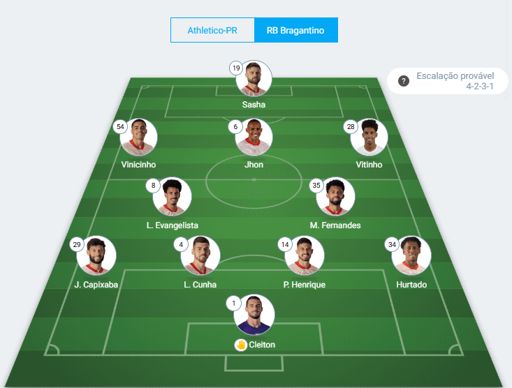 - Provável escalação do Red Bull Bragantino: Cleiton; Hurtado, Pedro Henrique, L. Cunha, Juninho Capixaba; M. Fernandes, L. Evangelista, Jhon; Vitinho, Vinicinho e Sasha