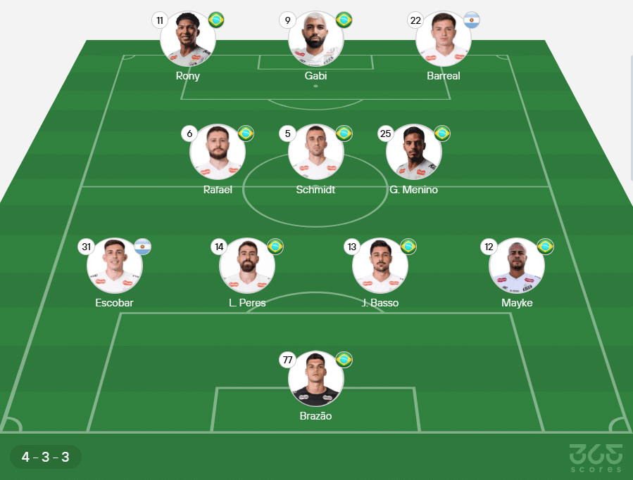 Santos: Gabriel Brazão; Mayke, Adonis Frías, Luan Peres e Escobar; João Schmidt, Bontempo e Gabriel Menino; Barreal, Rony e Gabigol.