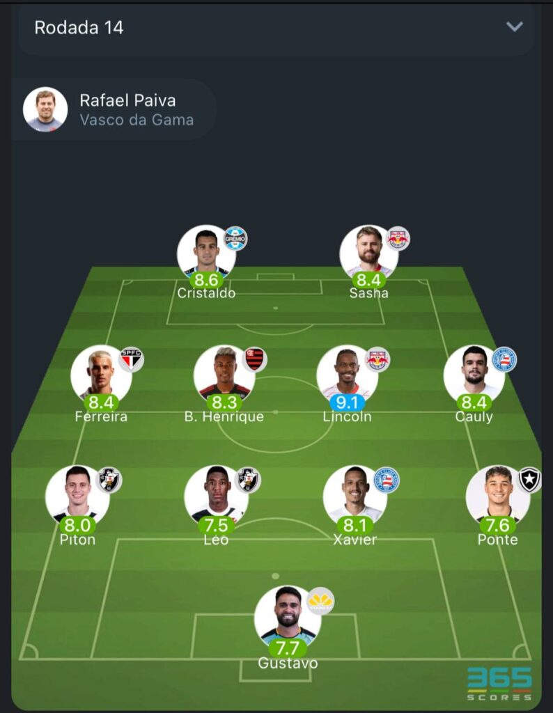 A importante vitória do Vasco por 2 a 0 em cima do Fortaleza fez com que a equipe tivesse três representantes no Time da Rodada 365Scores da 14ª rodada. Bahia e RB Bragantino também se destacaram com dois jogadores dentre os melhores. Destaque para Lincoln, do RB Bragantino, que foi o maior pontuador da rodada: 9.1.