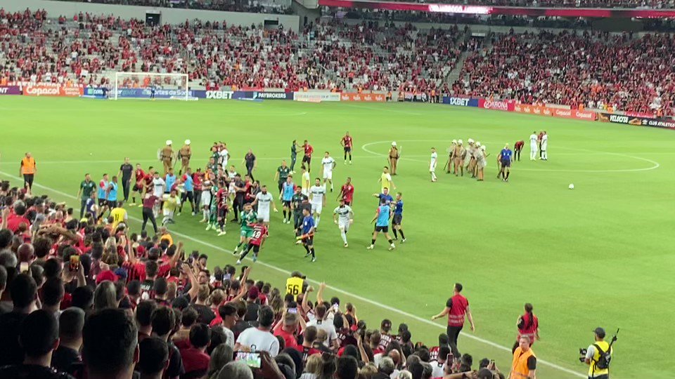 Devido à confusão, o árbitro precisou encerrar o Atletiba com antecedência, e treinadores e dirigentes entraram no gramado para acalmar os ânimos. A súmula vai indicar quantos jogadores foram expulsos.