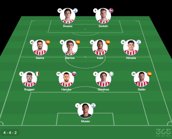 - Provável escalação do Atlético do Madrid: Musso; Galán, José Giménez, Hancko, Ruggeri; Almada, Koke, Barrios, Baena; Sorloth, Álvarez