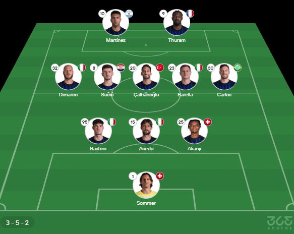 - Provável escalação da Inter de Milão: Sommer; Akanji, Acerbi, Bastoni; Carlos, Barella, Çalhanoglu, Sucic, Dimarco; Thuram, Lautaro Martinez