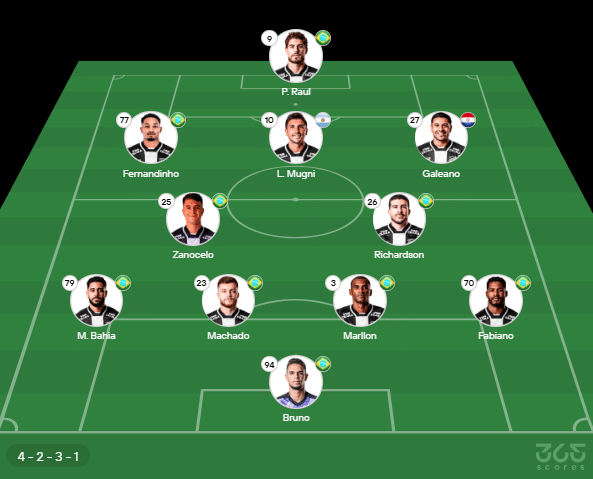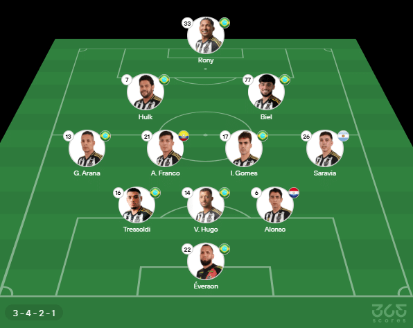 - Provável escalação do Atlético-MG: Everson; Alonso, V. Hugo, Tressoldi; Saravia, Igor Gomes, Alan Franco, Arana; Biel, Huk, Rony