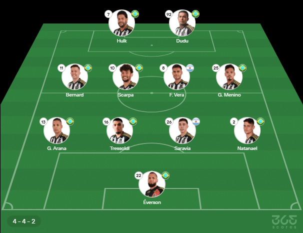 - Provável escalação do Atlético-MG: Everson; Natanael, Saravia, Tressoldi (Ivan Roman), Guilherme Arana; Gabriel Menino, Fausto Vera, Scarpa, Bernard; Dudu, Hulk.
