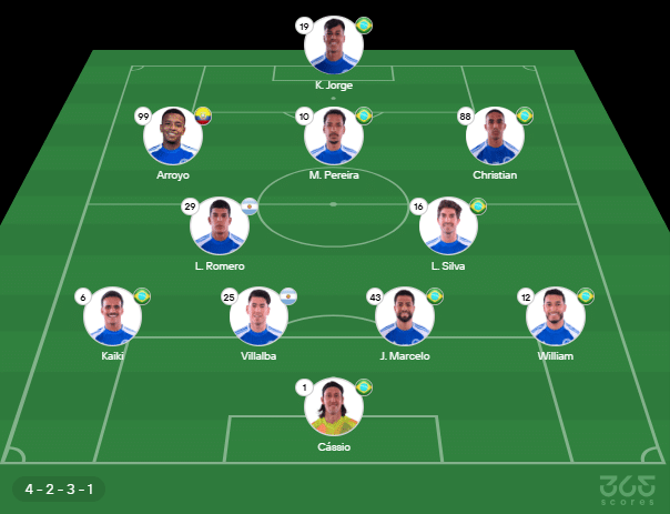 - Provável escalação do Cruzeiro: Cássio; William, J. Marcelo, Villalba, Kaiki; Lucas Silva, Lucas Romero, Matheus Pereira; Christian, Arroyo (Wanderson), Kaio Jorge
