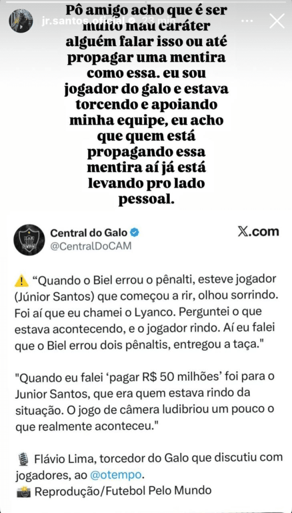 Depois de o torcedor que fez as gravações dar uma entrevista dizendo que Júnior Santos estava rindo durante as cobranças de pênaltis, o atacante se pronunciou e rebateu o atleticano.