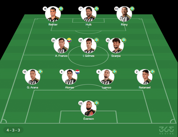 - Provável escalação do Atlético-MG:Everson; Natanael, Lyanco, Alonso, G. Arana; Scarpa, Igor Gomes, Alan Franco; Rony, Reinier, Hulk