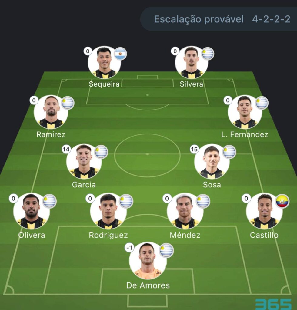 Provável escalação do Peñarol: De Amores; Castillo, Mendez, Rodriguez, Oliveira; Sosa, Damian Garcia, Fernandez e Ramirez; Darias, Silveira e Sequeira.
