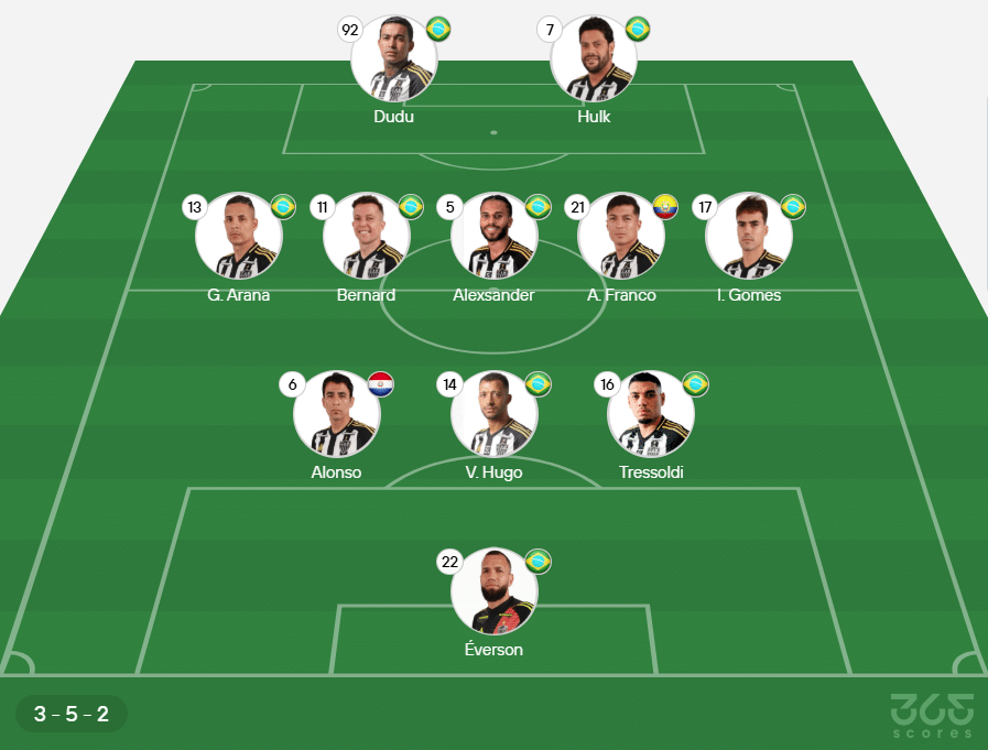 Escalação do Atlético-MG: Éverson; Ruan Tressoldi, Vitor Hugo e Júnior Alonso; Igor Gomes, Alan Franco, Alexsander, Bernard e Guilherme Arana; Dudu e Hulk.