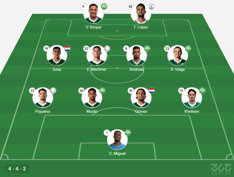 Escalação do Palmeiras: Carlos Miguel; Khellven, Gustavo Gómez, Murilo e Piquerez; Emiliano Martínez, Andreas Pereira, Raphael Veiga e Ramón Sosa; Flaco López e Vitor Roque.