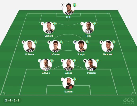 - Provável escalação do Atlético-MG: Éverson, Ruan Tressoldi, Lyanco, Victor Hugo; Natanael, Gustavo Scarpa, Igor Gomes, Guilherme Arana, Rony, Bernard; Hulk
